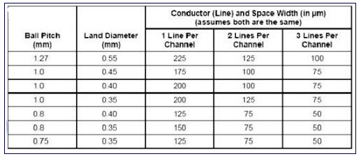 一旦完成了Dog bone型扇出,并且確定了特定的過孔焊盤尺寸,二步就是定義從BGA進入電路板內(nèi)層的走線寬度。確認走線寬度時要考慮許多因素。表1顯示了走線寬度。走線之間要求的小空間限定了BGA迂回布線空間。重要的是要知道,減小走線之間的空間將增加電路板制造成本。