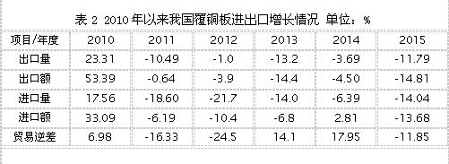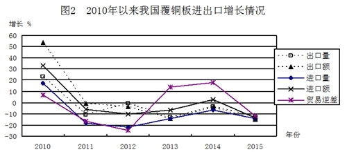 圖2和表2是2010年以來我覆銅板各年進出口的增長情況。從2011年-2015年的“十二五”期間,各年的進出口量、額,除2014年的進口額出現(xiàn)一次微幅同比正增長外,其它年份的同比都處于負增長。貿(mào)易逆差在3.7~4.3億美元之間起伏變化。“十二五”期間我覆銅板的際貿(mào)易完全呈現(xiàn)出一種新的“常態(tài)”。