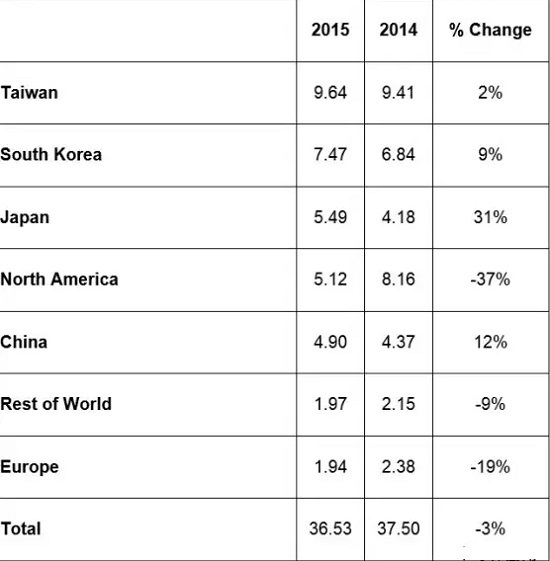 來源:SEMI報告:2015年全球半導體設備銷售額為365億美元