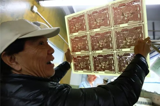 勝得電子老總呂俊宏在展示用智能機(jī)器人流水線生產(chǎn)的電路板半成品