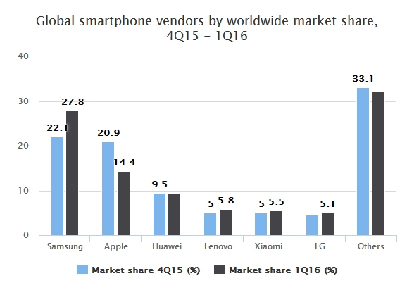 TrendForce公司稱,蘋(píng)果在全球手機(jī)市場(chǎng)上所占的份額從2015年四季度的20.9%下跌到了2016年一季度的14.4%;而它的競(jìng)爭(zhēng)對(duì)手三星,得益于其Galaxy S7和Galaxy S7 Edge手機(jī)的強(qiáng)勁銷售態(tài)勢(shì),其市場(chǎng)份額從22.1%增長(zhǎng)到了27.8%。