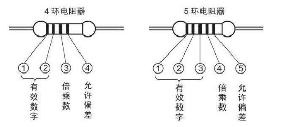 2、色環標注法使用多,一道色環表示阻值的大一位數字,二道色環表示二位數字,三道色環表示阻值未應該有幾個零,四道色環表示阻值的誤差。