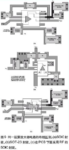 圖9示出了采用SOIC封裝(a)和SOT-23封裝(b)的運算放大器之間的布線區(qū)別。每種封裝都有它自身的一些問題。重點看(a),仔細觀察反饋路徑就發(fā)現(xiàn)有多種方法連接反饋。重要的是保證印制線長度短。反饋路徑中的寄生電感會引起振鈴和過沖。在圖9(a)和9(b)中,環(huán)繞放大器連接反饋路徑。圖9(c)示出了另外一種方法——在SOIC封裝下面連接反饋路徑——這樣就減小了反饋路徑的長度。每種方法都有細微的差別。一種方法會導(dǎo)致印制線過長,會增大串聯(lián)電感。二種方法采用了通孔,會引起寄生電容和寄生電感。在給PCB布線時必須要考慮這些寄生效應(yīng)的影響及其隱含的問題。SOT-23布線差幾乎是理想的:反饋印制線長度短,而且很少利用通孔;負載和旁路電容從很短的路徑返回到相同的地線連接;正電源端的電容(圖9(b)中未示出)直接放在PCB背面的負電源電容的下面。