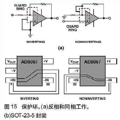 保護環(huán),或者說“隔離環(huán)”,是運算放大器常用的另一種屏蔽方法,它用于防止寄生電流進入敏感結(jié)點。其基本原理很簡單——用一條保護導(dǎo)線將敏感結(jié)點完全包圍起來,導(dǎo)線保持或者迫使它保持(低阻抗)與敏感結(jié)點相同的電勢,因此使吸收的寄生電流遠離了敏感結(jié)點。圖15(a)示出了用于運算放大器反相配置和同相配置中的保護環(huán)的原理圖。圖15(b)示出用于SOT-23-5封裝中兩種保護環(huán)的典型布線方法。