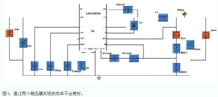 值得注意的是,高效率是84%,且此高效率是當輸入-輸出間的壓差很低時實現(xiàn)的。此例中,輸入/輸出比大于7。一般情況下,可以用兩級電路來降低級與級之間的比率,但通過兩個穩(wěn)壓器實現(xiàn)的效率不會更好。