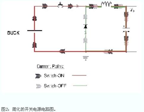 圖2所示的簡化電路圖對了解基本情況幫助甚大。看一看電流通路:把FET在導通狀態(tài)下的回路標記為紅色;把FET在截至狀態(tài)下的回路標記為綠色。我們可以觀察到兩種不同情況:有兩種顏色的區(qū)域和僅一種顏色的區(qū)域。我們必須特別關注后一種情況,因此時電流在零和滿量程之間交替變化。這些是具有高di/dt的區(qū)域。