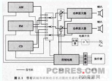 例如,在設計一個(模擬)光碟(CD) 機或者數字光碟(DVD) 機的電路時,在整個電器裝置的印制線路板中,既有模擬電路又有數字電路,這時候應當特別注意不要讓數字電路的信號干擾模擬電路的正常工作。為此,往往將這類電路原理圖首先分割成各部分分別具有不同功能的方框圖,并且明顯地標識出哪些導線是信號線,哪些導線是電摞線,哪些導線是接地線或屏蔽線。圖2. 1 是將一個帶有調幅和調頻收音機接收功能的光碟機方框圖分別標識出信號線、電源線與接地線的例子。