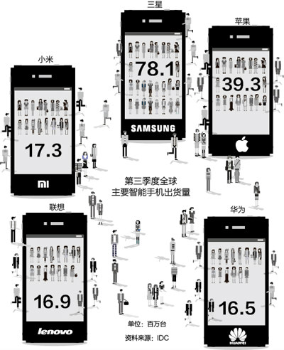 中手機廠商正在集體向全球三的位置發(fā)起沖擊。 10月30日,IDC發(fā)布研究報告稱,三季度全球智能手機出貨量為3.276億部,較去年同期的2.617億部增長25.2%,其中三星和蘋果位居前兩位,緊隨其后的是小米、聯(lián)想和LG。而在今年上半年,三名還是華為,LG和聯(lián)想分列四、五。