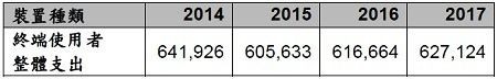 2014~2017年全球終端使用者設備支出(單位:百萬美元)